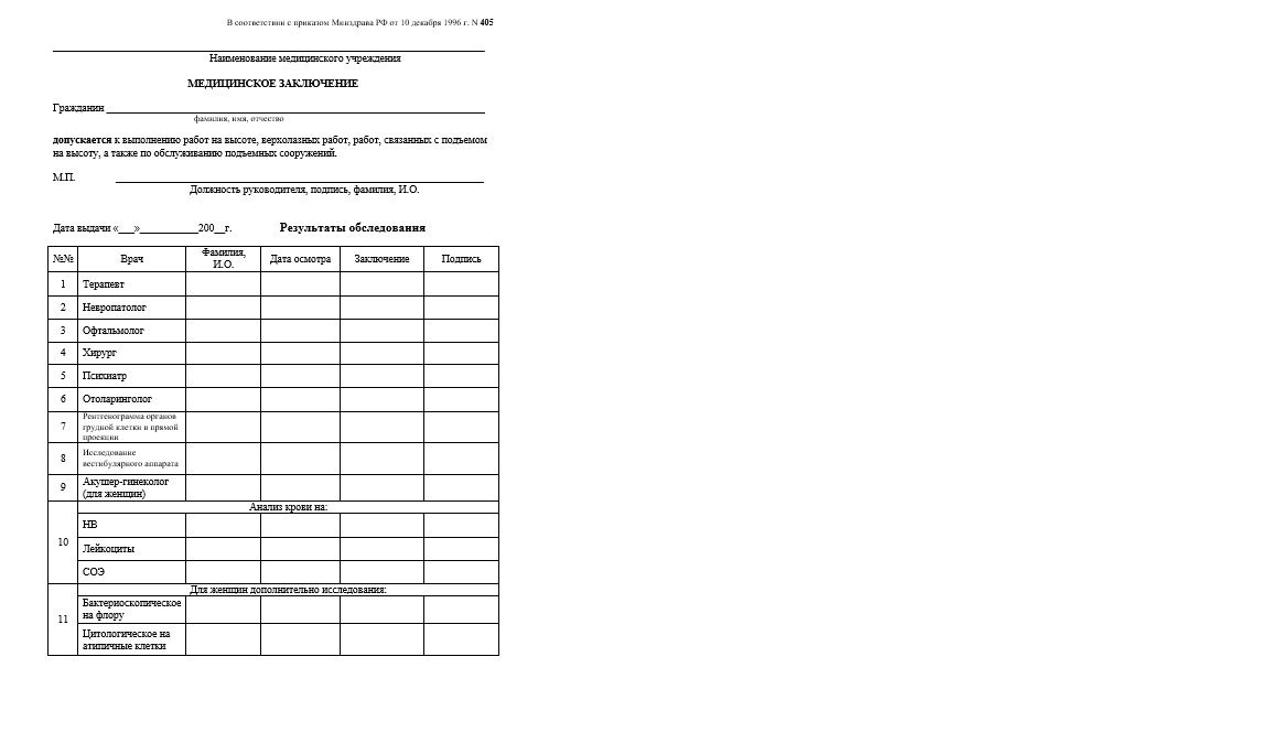 Справку для работ на высоте в СПб оформляют по результатам комиссии в муниципальной поликлинике или частном центре. Обследование комплексное и включает осмотр у окулиста, ЛОР-врача, невропатолога, хирурга, нарколога и психиатра. Женщинам дополнительно требуется осмотр у гинеколога. При необходимости пациенты проходят ФЛГ, ЭКГ, вестибулометрию. Разрешение на высотные работы подписывает терапевт. Заключение пишут на официальном бланке, заверяют подписью и печатью.