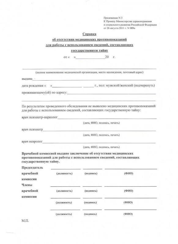 Зачастую оформление справки требуется при работе в области экономики, внешней политики, науки, техники, военной сфере. Точный перечень профессиональных областей, порядок проведения медицинского осмотра закреплен законодательством РФ. Он указывается приказом от 26.08.11 г. Форма 989н четко определяет критерии состояния здоровья, разрешающие доступ к секретной информации, сведениям, составляющим государственную тайну.