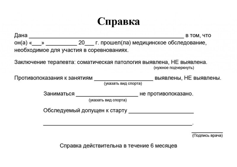 Если никаких противопоказаний к спорту и забегу не выявлено, то на справке пишут «годен» и указывают, что спортсмен допущен к соревнованиям по бегу с указанием дистанции. Комиссию проходят, предъявив предварительно удостоверение личности.