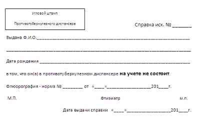 - Данные о постановке в туберкулезный диспансер на учет (либо то, что человек на нем не состоит);